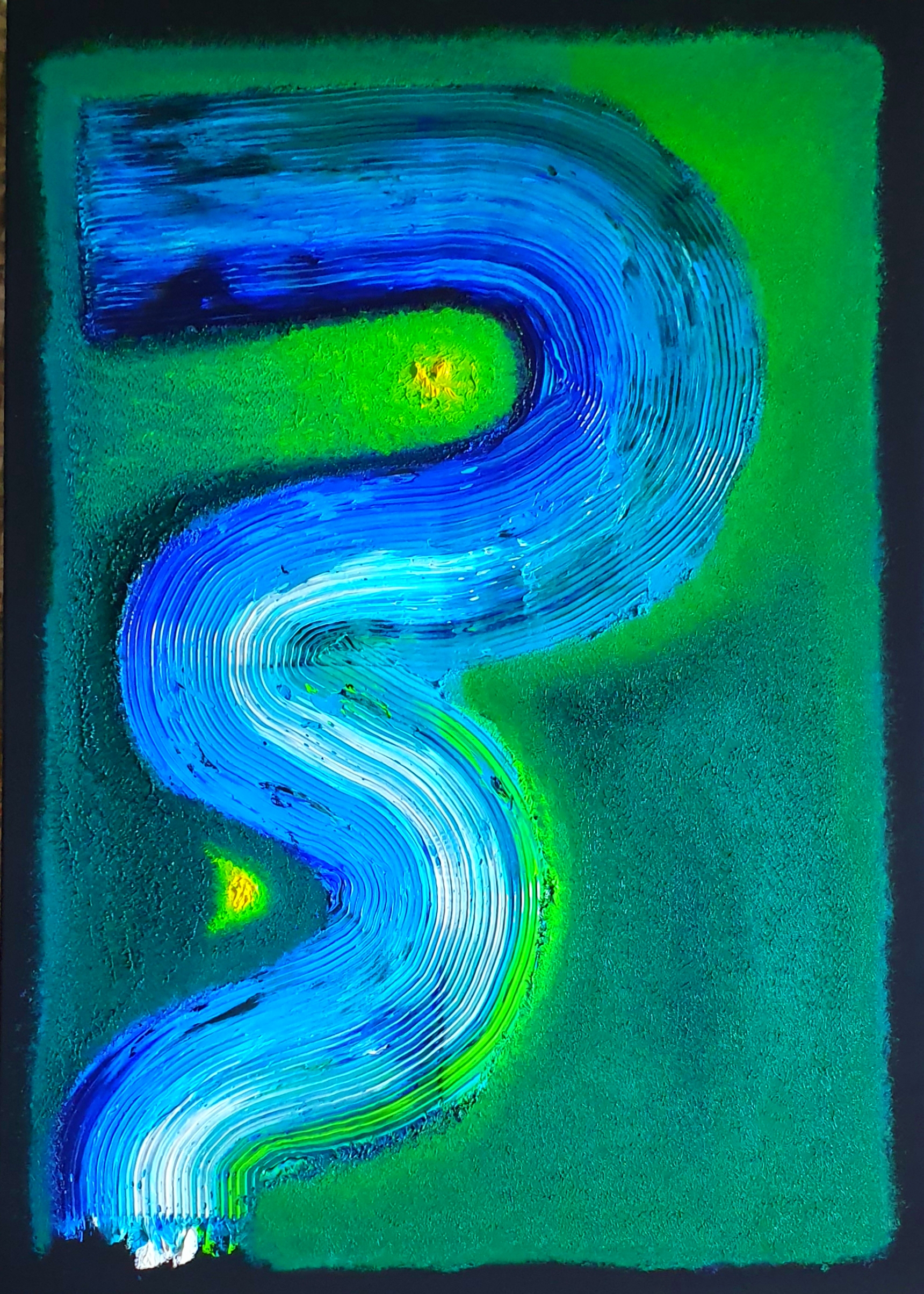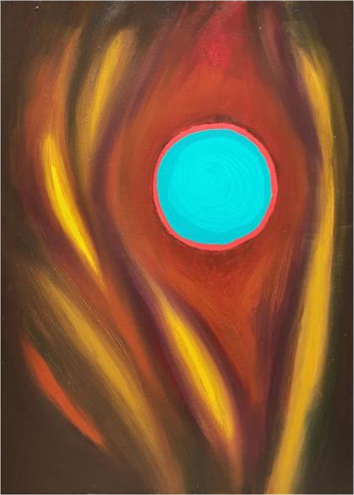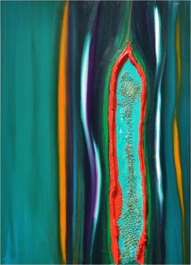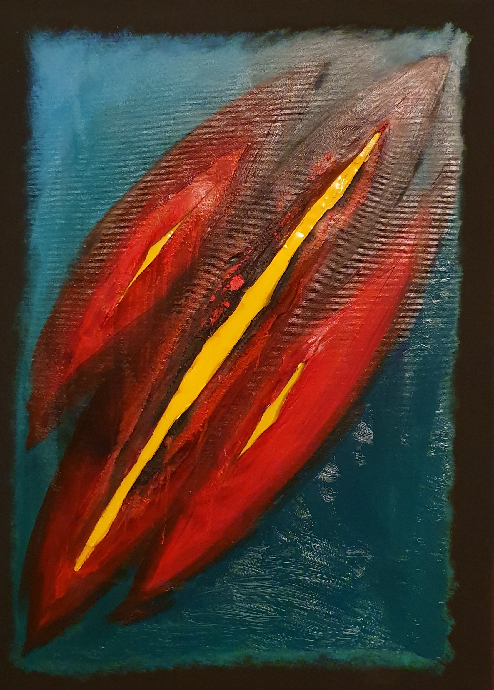 male ich nicht nur mit unterschiedlichen Malmitteln, sondern ich experimentiere auch mit Feuer, angebrannten/zerschnittenen Leinwänden und der Gießtechnik (Pouring) mit unterschiedlichen flüssigen Malmitteln (Gouache, Öl, Schellack, Acryl).